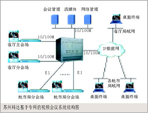。。各個(gè)地市局的分會場各部署一臺KDV8010A高清視頻會議終端,采用E1的專線方式接入到中心點(diǎn)MCU,而各個(gè)地市局域網(wǎng)中的桌面終端則通過IP數(shù)據(jù)網(wǎng)接入到MCU。