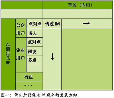 IT行業(yè)發(fā)展數(shù)十年,有一個共識,或是一種經(jīng)驗結(jié)論,大約是:在用“老工具解決新問題”、“老工具解決老問題”、“新工具解決老問題”、“新工具解決新問題”四者中,一般最先者最善,也極討巧,最后者則最為事倍功半。觀IM發(fā)展趨勢,似乎介于“新工具解決老問題”、“新工具解決新問題”二者之間,就體現(xiàn)在表中兩個箭頭上,是以錢景堪憂。
