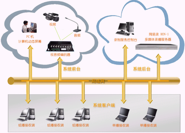 2. 系統(tǒng)后臺(tái):連接在網(wǎng)絡(luò)上即可,接受REN-1服務(wù)器管理端發(fā)送來的系統(tǒng)管理、維護(hù)指令,并負(fù)責(zé)將系統(tǒng)前臺(tái)發(fā)送來的視頻、音頻、計(jì)算機(jī)動(dòng)態(tài)屏幕進(jìn)行實(shí)時(shí)錄制和直播,它包括:網(wǎng)易錄媒體中心(REN-1),它為系統(tǒng)的核心,主要完成視頻、音頻、計(jì)算機(jī)動(dòng)態(tài)屏幕的錄制和直播;