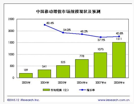 隨著中國移動電話用戶的不斷增長和移動增值服務(wù)的不斷發(fā)展創(chuàng)新,移動增值服務(wù)已經(jīng)成為現(xiàn)隨著市場的發(fā)展和不斷規(guī)范,中國移動增值服務(wù)市場將進(jìn)入相對平穩(wěn)的發(fā)展階段。據(jù)iResearch預(yù)測,中國移動增值服務(wù)的市場規(guī)模增長速度將逐年減緩,到2008年受奧運會影響增長速度提高,規(guī)模將突破1500億元。