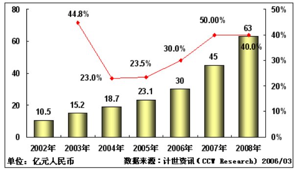 計(jì)世資訊(CCW Research)預(yù)測(cè)認(rèn)為,2006年和2007年視頻會(huì)議市場(chǎng)將以30%和50%的增長(zhǎng)率飛速增長(zhǎng)。市場(chǎng)規(guī)模分別達(dá)到30億和45億人民幣。而2008年隨著奧運(yùn)建設(shè)的告一段落,整個(gè)市場(chǎng)將進(jìn)入一個(gè)消化調(diào)整期,市場(chǎng)發(fā)展速度則逐步開始放慢。