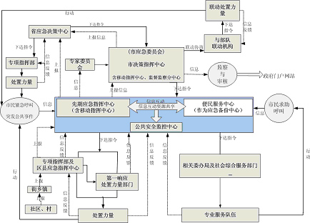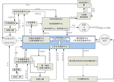 指政府決策指揮中心、先期指揮中心、便民服務(wù)中心、公共安全監(jiān)控中心,通常還有移動指揮中心和災(zāi)備中心,以及其它節(jié)點的建設(shè)。一般地,先期指揮中心與便民服務(wù)中心可互為備份。政府決策指揮中心對重大、特別重大突發(fā)公共事件進行協(xié)調(diào)、決策,偏重于自然災(zāi)害與生產(chǎn)安全方面,而一般、較重突發(fā)公共事件仍保持由各專業(yè)指揮部指揮、處置,只有當跨區(qū)、跨機構(gòu)需要協(xié)調(diào)時由政府決策指揮中心進行協(xié)調(diào)。