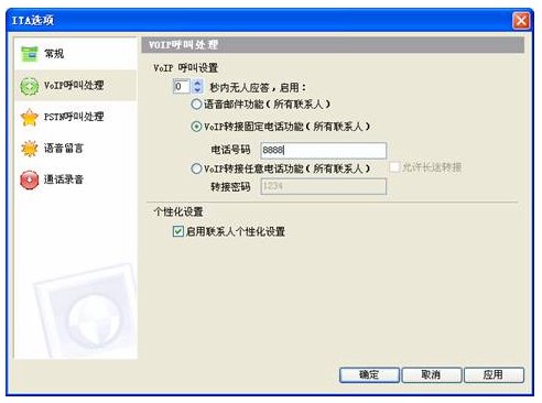 啟動 VoIP呼叫轉(zhuǎn)接固定電話功能,設(shè)置0秒啟動,轉(zhuǎn)接固定電話號碼為交換機(jī)內(nèi)置語音引導(dǎo)號8888,如圖,假設(shè)8888是交換機(jī)上配置的語音引導(dǎo)號。