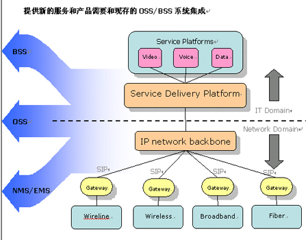 沒有一家電信公司可以花費(fèi)數(shù)年時(shí)間來(lái)重新開發(fā)新的服務(wù),服務(wù)提供商在舊的計(jì)費(fèi),開通,網(wǎng)管系統(tǒng)上已經(jīng)進(jìn)行了大量的投資,現(xiàn)存的大量關(guān)鍵系統(tǒng)必須得以重用并平滑過(guò)渡到三網(wǎng)合一時(shí)代。