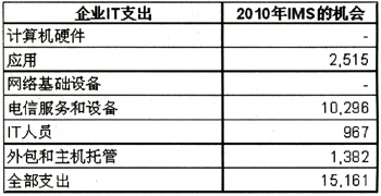2010年預(yù)計(jì)IMS應(yīng)用在企業(yè)中的收入機(jī)會(huì)(單位:百萬美元)