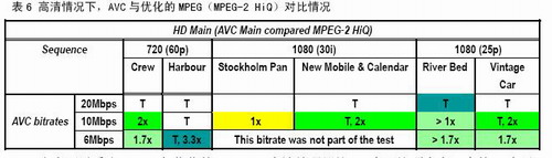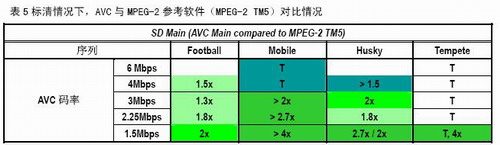 總體上講,AVC與MPEG-2對比,85個比對中66對MPEG-2的碼率要達到1.5倍才能與AVC達到同樣質(zhì)量,其中51對MPEG-2碼率要達到AVC的2倍才能達到AVC的質(zhì)量。換句話說,在60%的情況下,AVC的編碼效率能夠達到MPEG-2的兩倍。