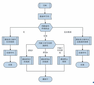 多媒體彩鈴用戶可以為某一位或某一組主叫用戶設(shè)定不同的視頻,當(dāng)某個(gè)主叫用戶來(lái)電時(shí),系統(tǒng)根據(jù)被叫用戶的狀態(tài)和主叫所屬的群組播放不同的視頻。如果被叫忙或者無(wú)法接通,則播放能表達(dá)被叫當(dāng)前狀態(tài)的默認(rèn)系統(tǒng)視頻;如果被叫空閑,則根據(jù)主叫號(hào)碼所屬的群組播放被叫為該群組定制的視頻。無(wú)論在哪種情況下,主叫都可以在手機(jī)上欣賞到精彩的視頻媒體。圖1是多媒體彩鈴業(yè)務(wù)使用流程。