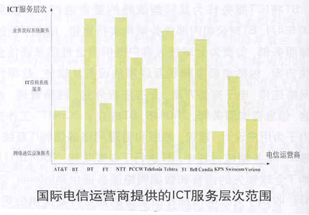 ICT服務(wù)的范圍大致可分為三個(gè)層次,一是面向網(wǎng)絡(luò)通信設(shè)施(包括網(wǎng)絡(luò)規(guī)劃、網(wǎng)絡(luò)系統(tǒng)集成、外包管理等)的服務(wù),二是面向IT應(yīng)用系統(tǒng)(包括軟件系統(tǒng)支持與維護(hù)、系統(tǒng)集成、應(yīng)用托管等)的服務(wù),三是面向業(yè)務(wù)流程系統(tǒng)(包括系統(tǒng)咨詢、業(yè)務(wù)流程外包等)的服務(wù)。從客戶視角來看,第三種服務(wù)的層次最高,第一種服務(wù)的層次最低,而電信運(yùn)營(yíng)商提供的ICT服務(wù)層次越高,則表明其在該領(lǐng)域拓展的范圍越廣。上述國(guó)際電信運(yùn)營(yíng)商提供的ICT服務(wù)層次范圍如下圖所示。