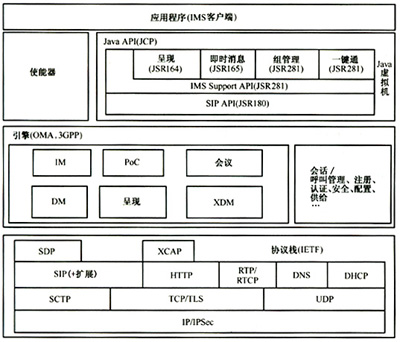 通過對于IMS客戶端相關規(guī)范的研究與分析,可以看出IETF提供了IMS客戶端所需要的協(xié)議部分,包括詳細的SIP信令消息交互,服務參數(shù)協(xié)商、媒體流的建立、XML文檔的交互等。3GPP和OMA提供了IMS客戶端所需要的服務引擎,與不同應用服務器之間的交互方式以及如何接入到IMS網(wǎng)絡等。JCP提供了一整套IMS客戶端上Java應用程序所需的標準Java應用編程接口。由此可以總結歸納出IMS客戶端軟件架構參考,具體參見圖2。