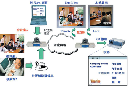 會議中常常需要同時傳送演講人的演講膠片和演講人的圖像,這套視訊系統(tǒng)非常方便地支持此功能,只需要把演講人的便攜機用線纜接到會場的終端上,通過終端的SXGA輸入功能可方便地將膠片信息發(fā)送到遠(yuǎn)端會場,遠(yuǎn)端會場通過終端的SXGA輸出接口將膠片內(nèi)容通過投影設(shè)備顯示出來,而終端的主視頻輸出接口顯示的是遠(yuǎn)端演講人的圖像。