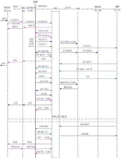 圖2為PSTN用戶A撥打一號通用戶,順呼軟交換域AG下POTS用戶B和SIP用戶C,其中軟交換和應(yīng)用服務(wù)器以SIP協(xié)議相連,軟交換和AG、軟交換和TG以H.248協(xié)議相連。可以看到,用戶B首先振鈴,振鈴達(dá)到規(guī)定時(shí)間后,應(yīng)用服務(wù)器取消了對用戶B的振鈴,轉(zhuǎn)而對用戶C振鈴。用戶C摘機(jī)應(yīng)答,通話結(jié)束,用戶C掛機(jī),系統(tǒng)釋放了呼叫。