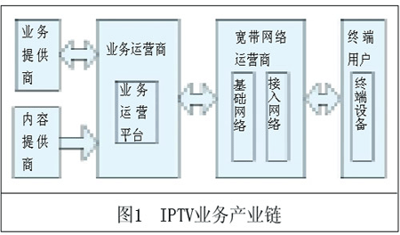 圖1所示的IPTV業(yè)務(wù)產(chǎn)業(yè)鏈中,主要角色包括內(nèi)容提供商/業(yè)務(wù)提供商(CP/SP)、業(yè)務(wù)運(yùn)營(yíng)商、網(wǎng)絡(luò)運(yùn)營(yíng)商和終端用戶。業(yè)務(wù)運(yùn)營(yíng)商具有IPTV業(yè)務(wù)運(yùn)營(yíng)資質(zhì),通過(guò)業(yè)務(wù)運(yùn)營(yíng)平臺(tái)保證業(yè)務(wù)的提供和管理運(yùn)營(yíng),起著業(yè)務(wù)主導(dǎo)的作用;內(nèi)容提供商為業(yè)務(wù)運(yùn)營(yíng)商提供內(nèi)容,業(yè)務(wù)提供商向業(yè)務(wù)運(yùn)營(yíng)商提供增值業(yè)務(wù),使得業(yè)務(wù)中的內(nèi)容和種類豐富多彩以滿足用戶的不同需求,內(nèi)容提供商和業(yè)務(wù)提供商一般能根據(jù)用戶的使用情況獲取收入分成;網(wǎng)絡(luò)運(yùn)營(yíng)商通過(guò)提供基礎(chǔ)網(wǎng)絡(luò)和接入網(wǎng)絡(luò)服務(wù)保證業(yè)務(wù)的傳送和質(zhì)量;終端用戶通過(guò)使用終端設(shè)備選擇和使用業(yè)務(wù),并支付相關(guān)費(fèi)用。