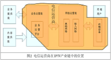 根據(jù)以上的分析,可以看出,電信運(yùn)營(yíng)商在IPTV產(chǎn)業(yè)鏈中居于主導(dǎo)地位,但與廣電部門(mén)的關(guān)系仍然需要理順,才能真正在IP網(wǎng)絡(luò)上發(fā)展好視頻類業(yè)務(wù)。圖2示意了電信運(yùn)營(yíng)商在IPTV中的位置。