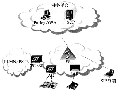 直接由SoftSwitch提供業(yè)務(wù),可提供基本電話業(yè)務(wù)、補(bǔ)充業(yè)務(wù)等;SoftSwitch具備SSP功能,通過(guò)SG與現(xiàn)網(wǎng)SCP互通,提供現(xiàn)有智能網(wǎng)業(yè)務(wù);SoftSwitch與應(yīng)用服務(wù)器之間通過(guò)SIP、H.323、Radius等協(xié)議互通;通過(guò)Parlay-GW/OSA-GW提供API接口,為第三方提供業(yè)務(wù)開發(fā)平臺(tái)。