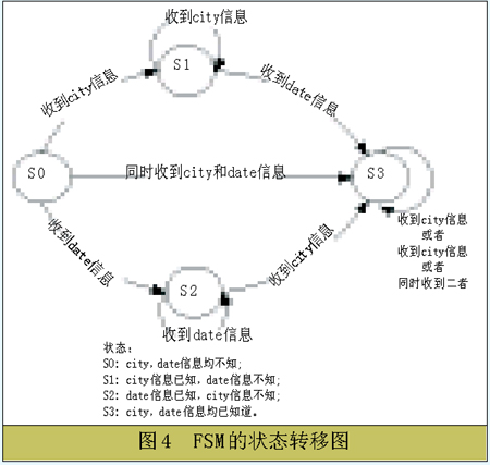 在總結(jié)了前人工作經(jīng)驗(yàn)和結(jié)合本系統(tǒng)的實(shí)際問題的基礎(chǔ)上,我們在對話管理的具體實(shí)現(xiàn)上,將框架理論和有限狀態(tài)自動機(jī)理論相結(jié)合,完成了一個智能的對話管理模塊。我們先將對話管理限制在天氣查詢領(lǐng)域。在系統(tǒng)中,通過人機(jī)之間的對話和確認(rèn),系統(tǒng)需要得到要查詢的時間和地點(diǎn)信息之后反饋查詢結(jié)果。