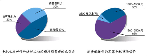 而根據(jù)調(diào)查結(jié)果,國內(nèi)消費者對于黑莓手機市場售價的普遍接受范圍在2500元以下。有63%的消費者認為黑莓手機應(yīng)該在1500-2500元,30%的消費者認為可以在1000元到1500元之間,只有7%的人認為黑莓手機售價應(yīng)當超過2500元。