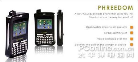 GUPP公司PHREEDOM手機(jī)基于VoWifi/GSM雙模的手機(jī)可以讓用戶自由選擇網(wǎng)絡(luò)。除了正常的GSM網(wǎng)絡(luò)之外,在有WiFi覆蓋的地方,用戶便可以使用WiFi網(wǎng)絡(luò)進(jìn)行通話,從而節(jié)約話費(fèi)。在WiFi環(huán)境中,它還也可以進(jìn)行網(wǎng)頁瀏覽、郵件收發(fā)、數(shù)據(jù)下載等操作。