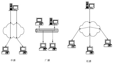 目前此類業(yè)務(wù)在IP網(wǎng)上幾乎都是采用IP組播的方式來實現(xiàn)的。IP網(wǎng)通信包括三種通信方式(如圖1所示):單播(Unicast)、廣播(Broadcast)和組播(Multicast)。單播是指源主機(jī)向指定單個目標(biāo)主機(jī)發(fā)送數(shù)據(jù)信息,單播連接是一一對應(yīng)的,即一個發(fā)送者只能對應(yīng)一個接收者;廣播指源主機(jī)向一個網(wǎng)絡(luò)段中的所有主機(jī)發(fā)送數(shù)據(jù)信息,即該網(wǎng)段所有主機(jī)都可以接收這個數(shù)據(jù)信息;組播介于單播、廣播之間,源主機(jī)向網(wǎng)絡(luò)中特定的一組主機(jī)發(fā)送數(shù)據(jù)信息,這些主機(jī)是靠組播地址來指定的。