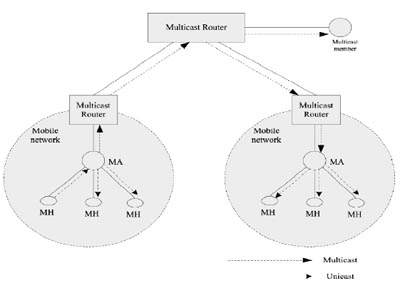 IETF的移動IP協(xié)議定義了家鄉(xiāng)代理(home Agent,簡稱HA)、外地鏈路、外地代理(foreign Agent,簡稱FA)、通信對端等概念,一個移動節(jié)點擁有兩個IP地址:家鄉(xiāng)地址和轉(zhuǎn)交地址。節(jié)點在移動過程中,家鄉(xiāng)地址不改變,發(fā)送到該節(jié)點的數(shù)據(jù)都通過家鄉(xiāng)地址與轉(zhuǎn)交地址之間的隧道轉(zhuǎn)發(fā)給移動節(jié)點。當(dāng)組成員切換時,包括網(wǎng)絡(luò)鏈路間切換的固有時延,以及重新加入組播組以及建立組播轉(zhuǎn)發(fā)樹的時延,都將導(dǎo)致組播成員丟包。