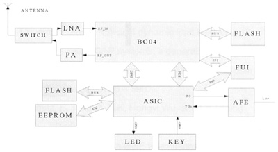 其中,BC04支持最大4個活動連接(包括耳機),同時支持兩路SCO語音,所以語音通過PCM和ASIC PCM相接可以有多路被送到模擬端,從而實現3方通話。ASIC部分實現PCM語音數據與模擬語音信號的相互轉換,通過發(fā)送和接收PSTN信令,負責對人機界面的控制。它通過GPIO(General Purpose Input/Output)控制LED和KEY的輸入和輸出,當需要通知BC04時,通過UART端口發(fā)送AT指令。AFE(Analog Front End)由分立元件組成,包括發(fā)送通路和接收通路,并實現接收通路的自動增益控制,使得到達ASIC的語音信號能夠達到一定的電平和信噪比要求。FUI(Firmware Upgrade Interface)實現對ASIC的調試和升級。