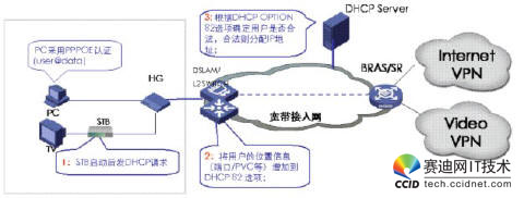 當(dāng)網(wǎng)絡(luò)設(shè)備收到STB的DHCP請(qǐng)求報(bào)文時(shí),需要在報(bào)文后添加OPTION82字段,此時(shí)有兩種模式進(jìn)行DHCP+認(rèn)證,一種是直接把DHCP報(bào)文送給DHCP服務(wù)器,由DHCP服務(wù)器根據(jù)OPT82字段來判斷該用戶是否為合法用戶,從而決定是否為其分配IP地址。另一種是DHCP報(bào)文先送到BRAS,由BRAS將OPT82字段放到RADIUS的一個(gè)子域里,通過RADIUS服務(wù)器來進(jìn)行用戶合法性認(rèn)證,若用戶合法,再由DHCP服務(wù)器分配IP地址。