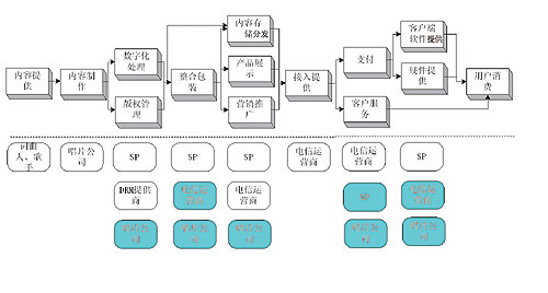 在線音樂(lè)業(yè)務(wù)的內(nèi)容一般由唱片公司提供,然后經(jīng)過(guò)在線音樂(lè)服務(wù)商的包裝,最后呈現(xiàn)給用戶(hù)。所以在線音樂(lè)業(yè)務(wù)的價(jià)值鏈大概由以下幾個(gè)環(huán)節(jié)構(gòu)成:內(nèi)容提供、內(nèi)容制作、數(shù)字化處理、版權(quán)管理、整合包裝、內(nèi)容存儲(chǔ)分發(fā)、產(chǎn)品展示、營(yíng)銷(xiāo)推廣、接入提供、支付、客戶(hù)服務(wù)、客戶(hù)端軟件提供、硬件提供和用戶(hù)消費(fèi)等。