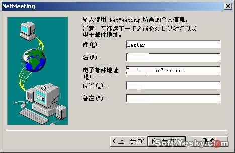 首次運(yùn)行Netmeeting,軟件會出現(xiàn)一個向?qū)В髮τ脩粜畔⑦M(jìn)行簡單的設(shè)定,單擊下一步,輸入個人信息,如圖4所示: