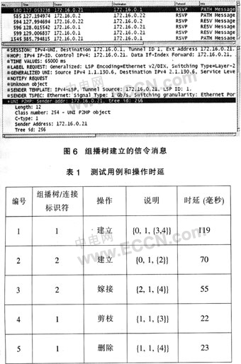 1出發(fā)的組播樹和單播連接,結果如表1所列。圖6顯示了Ethereal捕獲的組播樹建立的信令消息。在解開的Path消息中,可以發(fā)現(xiàn)經(jīng)過擴展的UNI組播對象。然后,對已存在的連接進行了動態(tài)的修改。在第三個測例中,一個葉子被添加到單播連接上并使其變?yōu)橐豢媒M播樹。在嫁接和剪枝的操作中,業(yè)務生成器在已建立的連接上沒有觀察到丟包的現(xiàn)象。