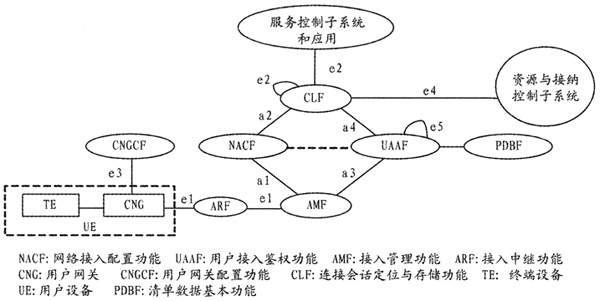 NASS實現(xiàn)IP地址分配、傳送層的認證和授權(quán)、接入網(wǎng)配置、位置信息的管理等功能,在移動或者游牧的場景下,NASS負責控制終端的接入,完成對用戶附著于接入網(wǎng)絡(luò)的管理。NASS的基本架構(gòu)[4]如圖2所示,由網(wǎng)絡(luò)接入配置功能(NACF)、接入管理功能(AMF)、連接會話定位與存儲功能(CLF)等邏輯功能單元組成。