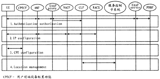 AMF負責翻譯UE的接入請求,將UE的IP地址分配請求以及網(wǎng)絡(luò)配置參數(shù)請求轉(zhuǎn)發(fā)至NACF,將用戶鑒權(quán)請求轉(zhuǎn)發(fā)給用戶接入鑒權(quán)功能(UAAF),反向則將來自NACF或UAAF的響應(yīng)轉(zhuǎn)發(fā)給UE。