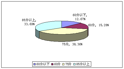 A、不及格(12.67%) B、60分(15.28%) C、75分(38.36%) D、85分以上(33.69%)