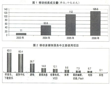 日本的在線購物和拍賣市場起步較晚,但發(fā)展速度較快,用戶的認知度也比較高,有41%~48%的移動互聯(lián)網(wǎng)用戶使用過該項業(yè)務(wù)。十幾歲到二十幾歲的女性較傾向于使用該業(yè)務(wù)。2006年移動拍賣的成交量為1295億日元,占到了通過手機在線購買成交量的1/2(見圖1)。