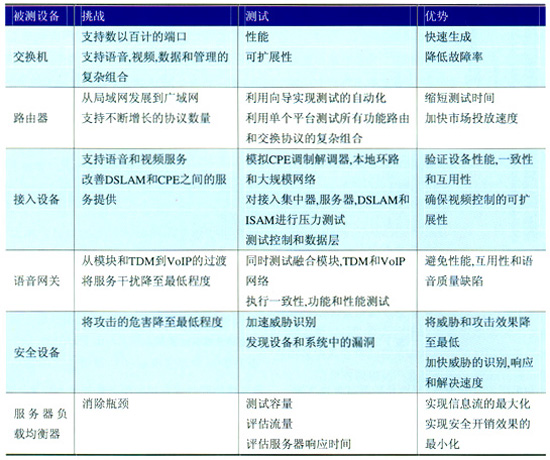網(wǎng)絡(luò)設(shè)備制造商必須能夠驗(yàn)證每一種被測(cè)設(shè)備(DUT),如交換機(jī)、路由器、接入設(shè)備、語(yǔ)音網(wǎng)關(guān)、安全設(shè)備和服務(wù)器負(fù)載均衡器的可擴(kuò)展性、可靠性和性能,同時(shí)還需要確定這些設(shè)備在包含有歷史語(yǔ)音和數(shù)據(jù)組件的真實(shí)服務(wù)商網(wǎng)絡(luò)中會(huì)有怎樣的表現(xiàn)。