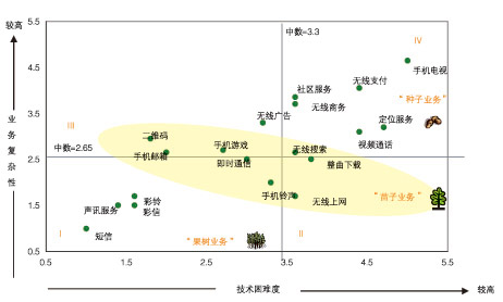 根據(jù)“業(yè)務(wù)復(fù)雜性—技術(shù)困難度”模型,可以清晰地看到一個業(yè)務(wù)的成功商用和業(yè)務(wù)復(fù)雜性與技術(shù)困難度密切相關(guān),如短信和彩鈴等復(fù)雜性與技術(shù)困難度都很低的業(yè)務(wù)是比較容易成功商用的,將這一類業(yè)務(wù)歸類為“果樹業(yè)務(wù)”,在第一象限(象限I)。還有一些業(yè)務(wù)如即時通信、整曲下載和無線搜索等業(yè)務(wù),已經(jīng)開始快速增長但是其用戶規(guī)模和收入量都還低于“果樹業(yè)務(wù)”,在業(yè)務(wù)復(fù)雜性與技術(shù)困難度坐標中這類業(yè)務(wù)處于4個象限交匯的中部區(qū)域(即圖中黃色區(qū)域),由于業(yè)務(wù)復(fù)雜性和技術(shù)困難度都會隨時間而減小,從而這一區(qū)域的業(yè)務(wù)會向第一象限演進,這類業(yè)務(wù)稱為“苗子業(yè)務(wù)”,即在3年內(nèi)能夠成熟的業(yè)務(wù)。在坐標系的右上角第四象限,即業(yè)務(wù)復(fù)雜性和技術(shù)困難度均較高的業(yè)務(wù),稱之為“種子業(yè)務(wù)”,這類業(yè)務(wù)在短期內(nèi)很難快速成長。