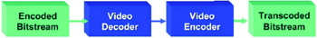 視頻轉(zhuǎn)碼是一個(gè)高運(yùn)算負(fù)荷的過程,需要對(duì)輸入的視頻流進(jìn)行全解碼、視頻過濾/圖像處理、并且對(duì)輸出格式進(jìn)行全編碼。最簡(jiǎn)單的轉(zhuǎn)碼過程(圖3)僅僅涉及到解碼一個(gè)比特流和用不同的編解碼器重新編碼兩個(gè)步驟。這種硬轉(zhuǎn)碼看似很簡(jiǎn)單,只需要一個(gè)解碼器和一個(gè)編碼器,但是最終顯示結(jié)果并不理想,因?yàn)橐曨l數(shù)據(jù)解碼后重新編碼會(huì)降低畫質(zhì)。