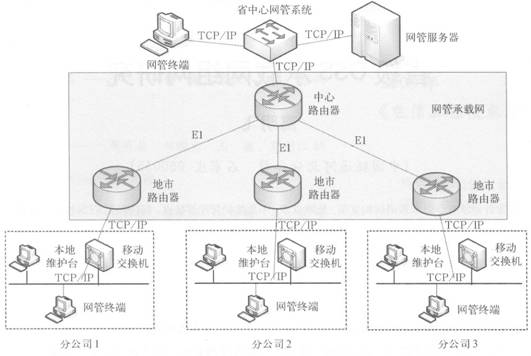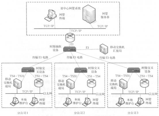 同樣以移動網(wǎng)為例,例子中移動交換機到維護終端支持TCP/IP方式,分公司具有本地維護終端和網(wǎng)管終端兩種類型的維護臺。本地維護終端通過以太交換機直接與移動交換機相連;網(wǎng)元和網(wǎng)管終端通過以太網(wǎng)接入邊緣路由器,經(jīng)路由器接.el轉(zhuǎn)化以El方式接入到時隙抽取設(shè)備中,由于傳送網(wǎng)管信息占用帶寬較小,