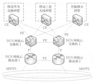 P路由器和PE設(shè)備為口字形連接,各自通過VRRP 協(xié)議進行熱備。P設(shè)備直接通過FE口接入MSTP傳輸網(wǎng)。
