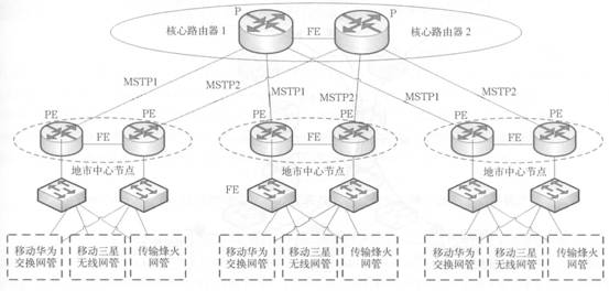 在地市分公司的中心節(jié)點配置兩臺中端PE路由器和兩臺以太網(wǎng)交換機,負(fù)責(zé)各個業(yè)務(wù)網(wǎng)元、終端的規(guī)范接入,通過在交換機上劃分不同的VLAN對各個業(yè)務(wù)系統(tǒng)進行隔離,各業(yè)務(wù)接入到各自的VPN中。PE