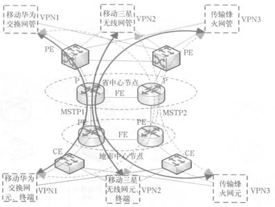 采用MPLS VPN技術(shù)可以把現(xiàn)有的物理實體IP網(wǎng)絡(luò)分解成邏輯上隔離的網(wǎng)絡(luò),各隔離開的網(wǎng)絡(luò)之間感知不到對方網(wǎng)絡(luò)的存在。在物理上是同一硬件設(shè)備承載,但在邏輯上網(wǎng)絡(luò)是完全隔離的。0SS承載網(wǎng)正是需要這樣的一種承載方式,把各專業(yè)各廠家的多種網(wǎng)管配置到不同的邏輯業(yè)務(wù)區(qū)VPN中,如移動華為交換網(wǎng)管配置到VPNl中,移動三星無線網(wǎng)管配置到VPN2中,傳輸烽火網(wǎng)管配置到VPN3中,對每一套網(wǎng)管系統(tǒng)都使用同樣的物理承載不同的VPN完成從地市分公司的網(wǎng)元或終端到網(wǎng)管服務(wù)器的連接,各VPN之間相互獨立、相互隔離。