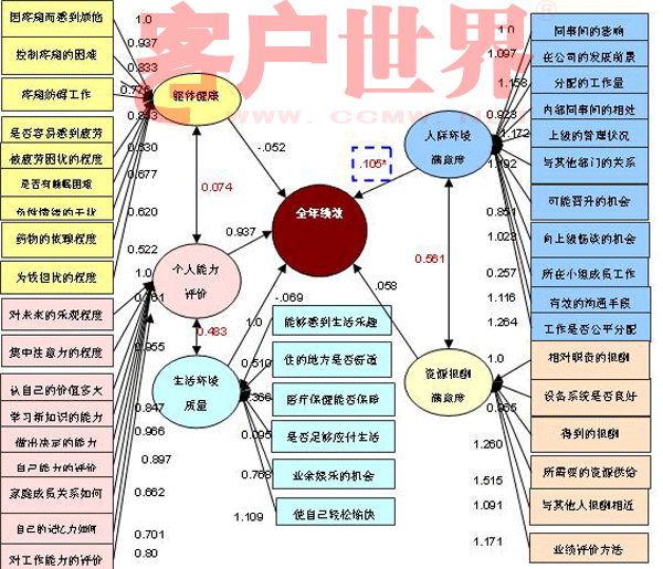 4. 客服代表工作滿意度的人際環(huán)境滿意度能夠顯著預(yù)測客服代表的全年績效。通過將客服代表生活質(zhì)量問卷和工作滿意度問卷的得分情況與客服代表全年績效之間進(jìn)行全模型回歸分析,發(fā)現(xiàn)工作滿意度中的人際環(huán)境滿意度能夠顯著預(yù)測客服代表的全年績效。