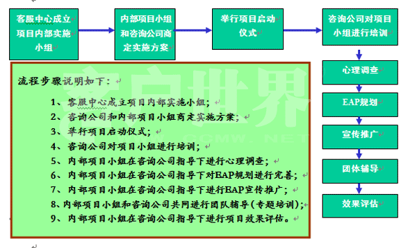 2007年11月,中國移動江蘇公司客戶服務(wù)中心EAP計劃正式啟動,這是中心為全體員工獻上的一份特別的“精神福利”。 EAP(Employee Assistance Program),中文被譯為“員工幫助計劃”,是由組織為其成員設(shè)置的一項長期的、系統(tǒng)的援助和福利計劃。它源于20世紀40年代的美國,目前美國中型和大型企業(yè)的EAP普及率為60―70%,英國有將近113個組織提供EAP服務(wù)、2200萬員工享受EAP服務(wù),而在我國近年來也有許多企業(yè)開始運用EAP服務(wù),中國陸續(xù)召開了三屆EAP年會,越來越多的企業(yè)開始關(guān)注員工的心理健康。