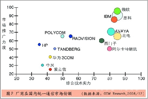 從當(dāng)前國內(nèi)統(tǒng)一通信市場競爭格局來看,在綜合技術(shù)實(shí)力方面,根據(jù)廠商所提供的統(tǒng)一通信解決方案中所能夠提供的各種溝通方式融合的程度以及每個(gè)具體功能技術(shù)水平等綜合因素考慮,處于前幾位的分別是思科、微軟、北電、IBM和Avaya,它們的產(chǎn)品線比較長,產(chǎn)品功能也相對比較全面。