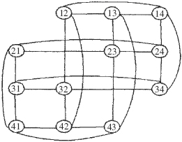 一個(gè)排列圖實(shí)例A4,2的拓?fù)浣Y(jié)構(gòu)如圖2所示。排列圖An,2僅能容納n(n-1)個(gè)主機(jī)。為使系統(tǒng)可容納任意多主機(jī),可將參與主機(jī)組合成多個(gè)An,2結(jié)構(gòu),這些An,2按照樹(shù)形結(jié)構(gòu)連接在一起,稱為分層排列圖結(jié)構(gòu)[6]。