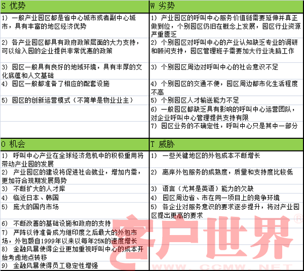 筆者在此更愿意用SWOT分析的模式來闡述中國呼叫中心產(chǎn)業(yè)園區(qū)的特點: