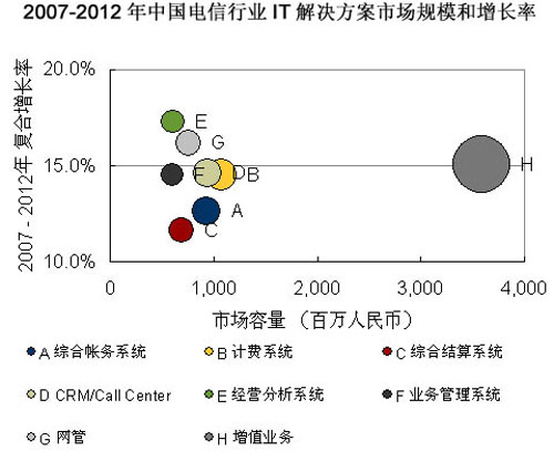 巨大的電信市場蛋糕給產(chǎn)業(yè)鏈的各級廠商都帶來良好的發(fā)展機遇,而其運營支撐系統(tǒng)市場無疑將是增長最快的一部分。據(jù)市場調(diào)查機構(gòu)IDC預(yù)計,2007年-2012年電信行業(yè)將注重運營支撐系統(tǒng)的全業(yè)務(wù)運營整合和支持前端業(yè)務(wù),因此3G增值業(yè)務(wù)、經(jīng)營分析系統(tǒng)、客戶關(guān)系管理系統(tǒng)、IT服務(wù)管理系統(tǒng)等建設(shè)將實現(xiàn)快速增長。運營商的已有項目仍然會持續(xù)升級維護,以及配合全業(yè)務(wù)運營作出功能上的提升。IDC預(yù)計,2012年電信行業(yè)IT解決方案整體市場規(guī)模將達到193.5億元人民幣。