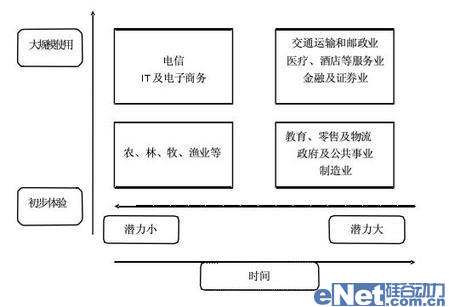 象限2--代表位于該象限的行業(yè)只是初步使用通信產(chǎn)品,并且該行業(yè)對通信產(chǎn)品需求不高,市場空間不大。該行業(yè)主要靠勞動力和自然資源獲取利潤,一般現(xiàn)代化程度較低,對通信要求不高,供應(yīng)商利潤不大。
