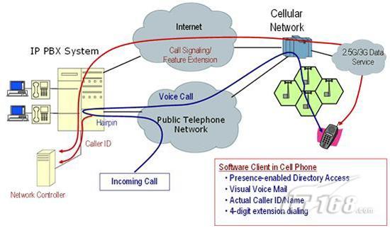 Sprint-Nextel最近推出了一種運用Femtocells技術(shù)、類似cFMC的解決方案,稱為Airave。按照這個方案,用戶把蜂窩通信網(wǎng)絡(luò)的一個小型基站同基地的寬帶互聯(lián)網(wǎng)連接在一起。如圖1所示,這兩種方案都是利用寬帶互聯(lián)網(wǎng)和蜂窩通信網(wǎng)絡(luò)其中之一實現(xiàn)Voip,不同的區(qū)別只是本地的無線連接是運用Wi-Fi技術(shù)還是蜂窩通信網(wǎng)絡(luò)。對企業(yè)用戶而言,主要缺點是,這兩種實現(xiàn)方式提供的都是由用戶主導(dǎo)的單一語音服務(wù),而沒有面向企業(yè)PBX或移動UC系統(tǒng)的接口。