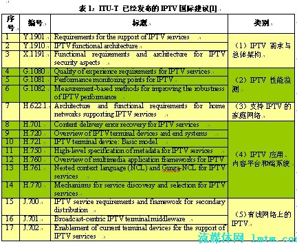 ITU-T已經(jīng)推出的IPTV國(guó)際標(biāo)準(zhǔn)涉及需求和架構(gòu)、性能監(jiān)測(cè)、家庭網(wǎng)絡(luò)、應(yīng)用平臺(tái)與端系統(tǒng)以及有線網(wǎng)上的IPTV等5大領(lǐng)域,是全球范圍內(nèi)IPTV產(chǎn)業(yè)界達(dá)成的共識(shí),具有廣泛的產(chǎn)業(yè)基礎(chǔ)。