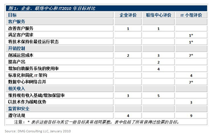 DMG的基準調研顯示IT有自己的優(yōu)先級:IT2010年的首要目標是滿足商業(yè)客戶的需求并使企業(yè)的技術和應用軟件運行在最佳狀態(tài)。這表明IT企業(yè)是帶著強烈的支持企業(yè)客戶目標和目的的意愿步入2010年的。但令人失望的是IT企業(yè)并沒有努力去了解他們客戶的目標。這種目標上的不一致是導致IT和聯絡中心之間缺乏信任的主要原因。