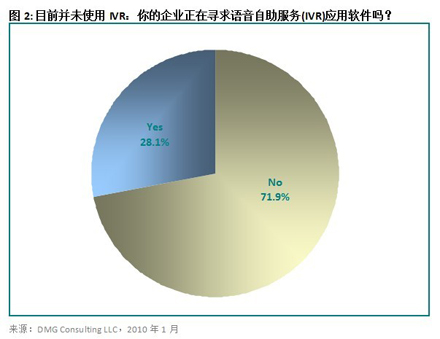 28.1%目前還沒有使用IVR系統的公司正在積極尋求語音自助服務解決方案來幫助自己達成目標,這一數字高得頗讓人驚訝。見圖2。經濟衰退促使那些曾經對使用自助服務技術猶豫不決的企業(yè)下定決心投資購買此類解決方案。一個具有正確規(guī)劃、設計和投放過程的IVR系統能夠將人工代理處理的電話量降低20%到90% (長期來說),具體數字有賴于聯絡中心的目的以及編入解決方案內部的任務。IVR用戶的增長勢頭有望在經濟形勢好轉之后仍然延續(xù)下去。一個經過良好設計并成功實施的IVR方案所帶來的利益和節(jié)約的成本是即便最不情愿使用它的經理都不得不承認的。